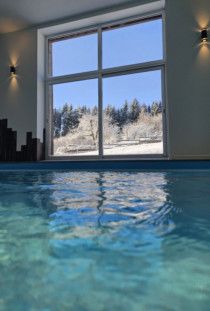 L’eau est chauffée tout le temps à 29 degrés afin que, quelle que soit la température dehors, qu’il neige ou fasse un grand soleil… vous puissiez vous baigner toute l’année.